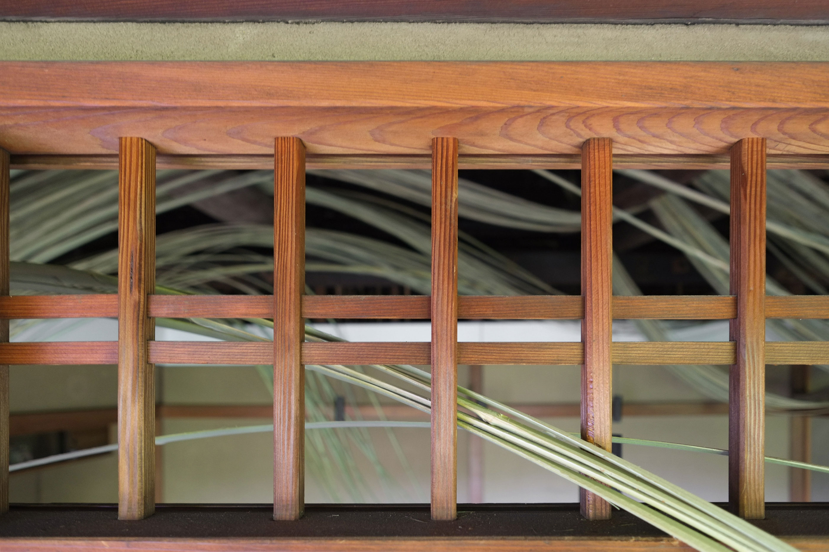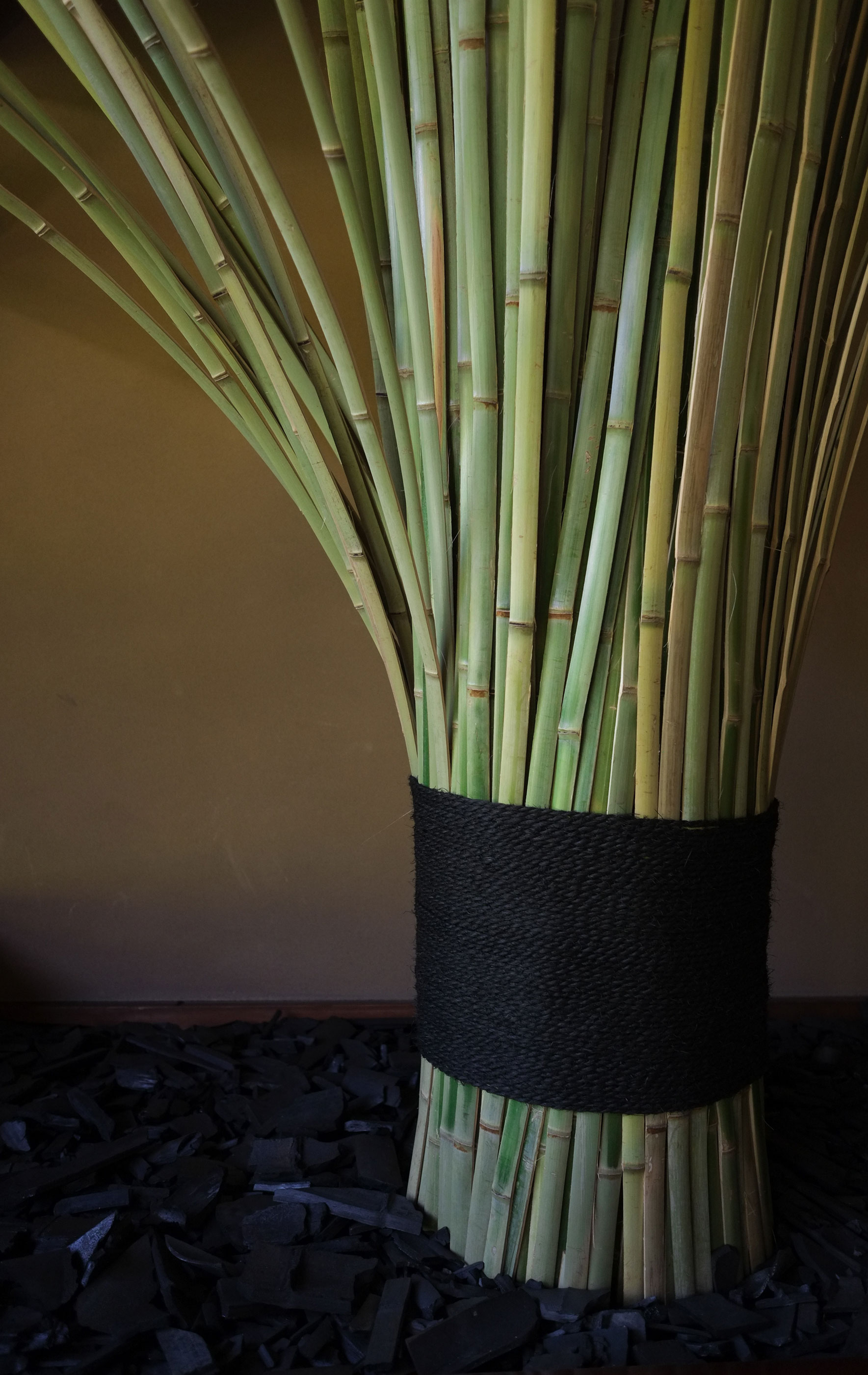 竹は、約25本ずつの束となって床の間から放射状に広がり、梁や構造体に絡むように展開。建物がもつ「移り変わり」という状態を、そのまま形にしたかのようです。竹の束は、伝統的な竹垣づくりに使われる黒染めの麻縄で結び、空間に静けさと緊張感をもたらしました。