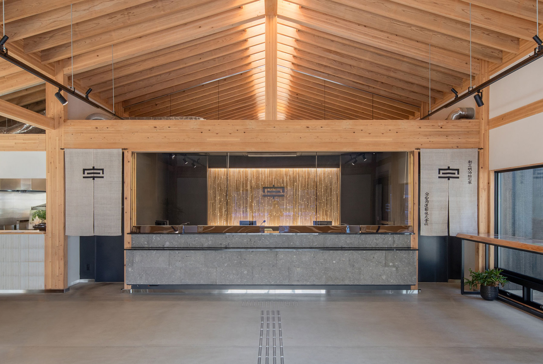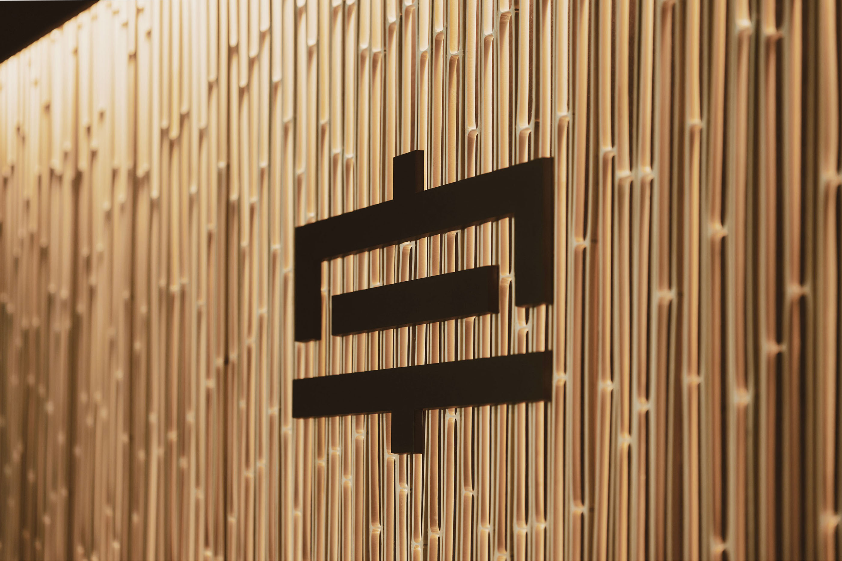 臼杵港フェリーターミナルの受付カウンター背面装飾として、「柾割(まさわり)竹」をご採用いただきました。竹特有の繊細な縦のラインが、空間全体に上質なリズムと温かみをもたらしています。背面には暖色系の間接照明を仕込み、竹表面の質感と陰影がより一層際立つように設計されています。竹材は光との相性が非常に良く、特に暖色系の照明を合わせることで、落ち着きとぬくもりを感じさせる柔らかな空間演出が可能です。来訪者を迎えるエントランスにおいて、天然素材の持つやさしさと現代的なデザインが調和する仕上がりとなりました。